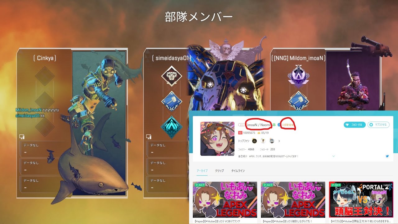 終わってから名前で調べたら配信してた。女の子だった!ミルダムの【imoaN / Naomi】さんって人でした。2021.5.21の配信です。
